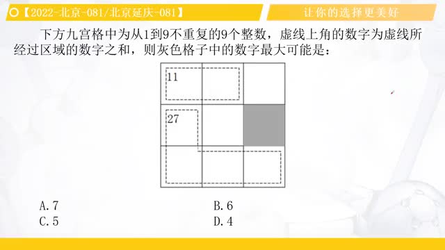 下方九宫格中为从1到9不重复的9个整数,虚线上角的数字为虚线所经过区域的数字之和,则灰色格子中的数字最大可能是: